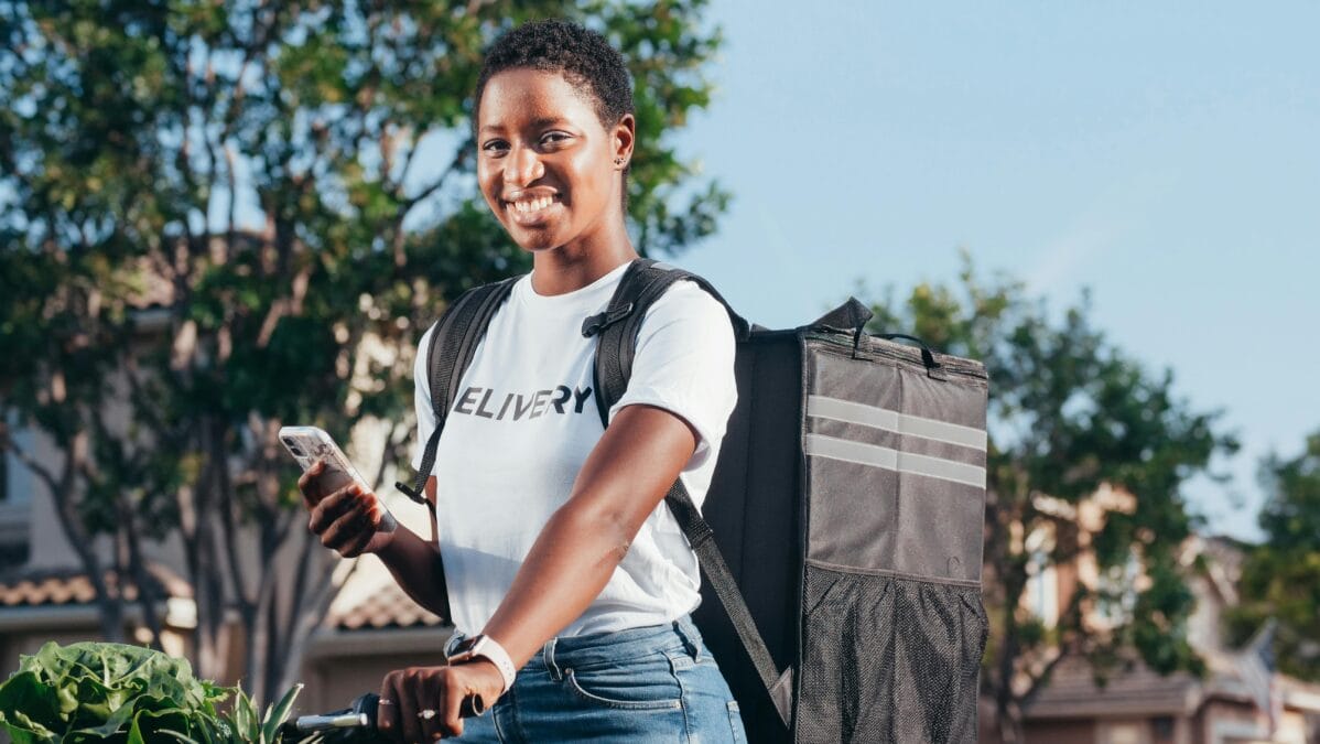 Smiling delivery woman using smartphone outdoors with a delivery bag.